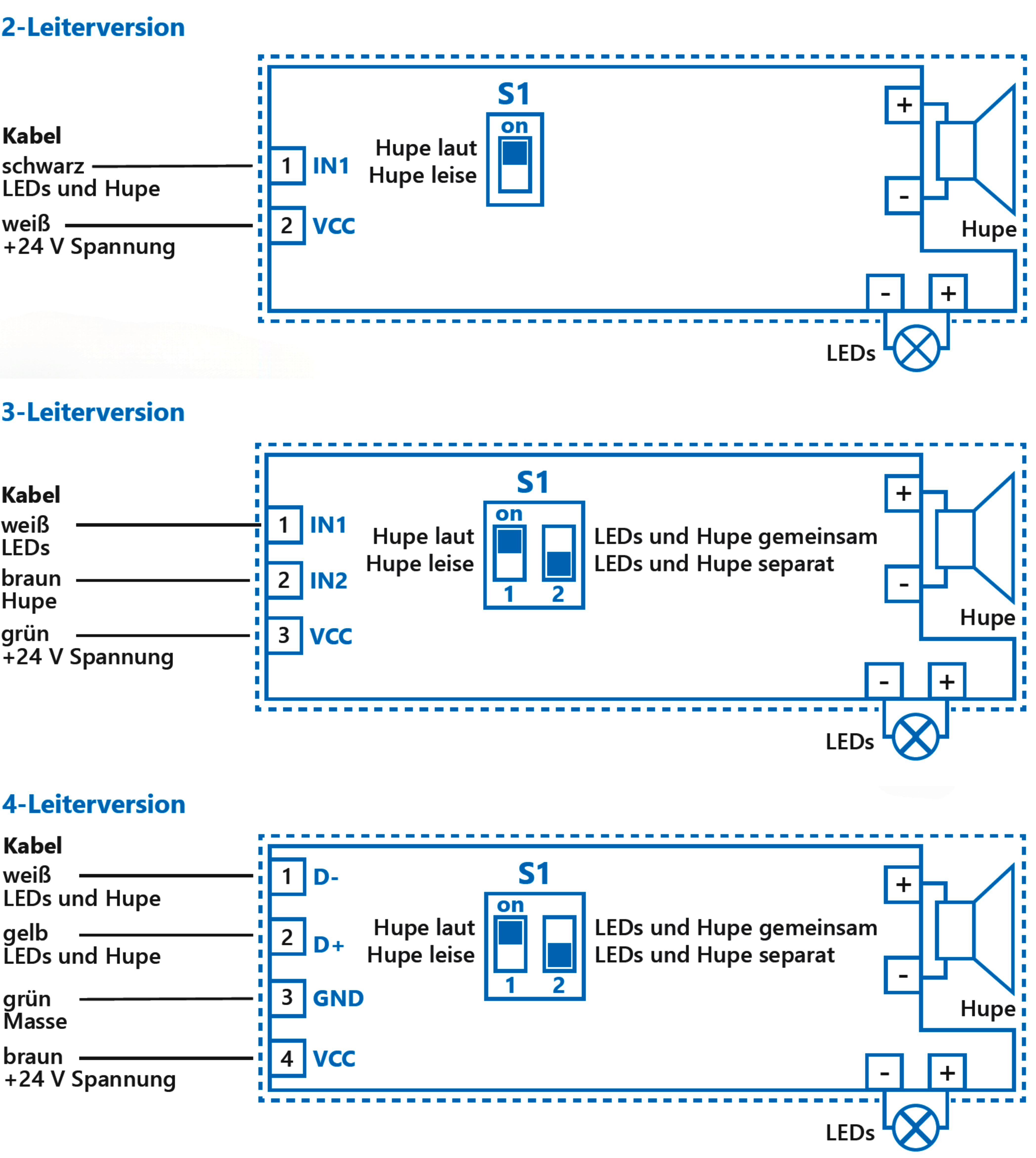 Bei den 2-Leiterversionen werden Hupe und LEDs gemeinsam angesteuert. Die 3-Leiterversionen erlauben es, Hupe und LEDs getrennt zu schalten. Zudem kann die Lautstärke der Hupe (max. > 100 dB(A) / min. 75 dB(A)) zweistufig geregelt werden
